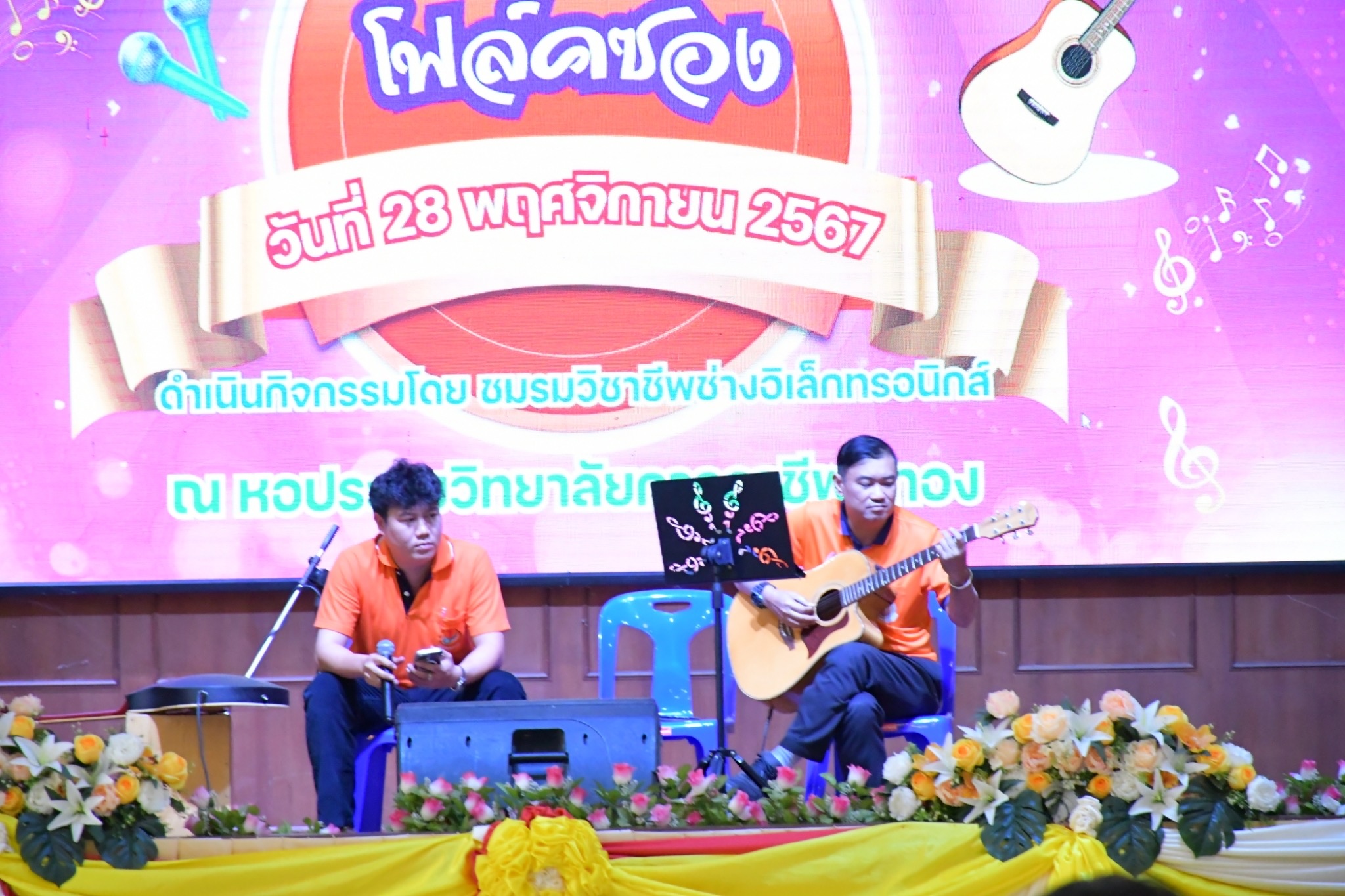 โครงการประกวดวงดนตรีโฟล์คซอง ประจำปีการศึกษา 2567 Posted on 29/11/2024 by งานประชาสัมพันธ์ in กิจกรรมวิทยาลัยและโครงการ // 0 Comments วิทยาลัยการอาชีพอู่ทอง โดยชมรมวิชาชีพช่างอิเล็กทรอนิกส์ จัดโครงการประกวดวงดนตรีโฟล์คซอง โดยนายปัญญา ตั้งธโนปจัย รองผู้อำนวยการฝ่ายบริหารทรัพยากร เป็นประธานกล่าวเปิดโครงการ ในวันพฤหัสบดีที่ ๒๘ พฤศจิกายน ๒๕๖๘ เวลา ๑๔.๐๐ น. ณ หอประชุม วิทยาลัยการอาชีพอู่ทอง