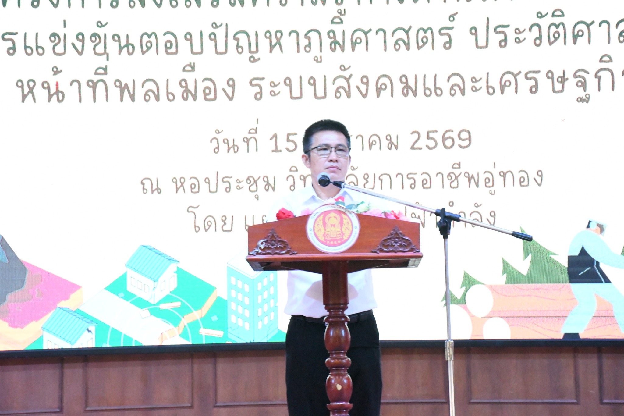 วิทยาลัยการอาชีพอู่ทอง โดยชมรมวิชาชีพช่างไฟฟ้ากำลัง จัดโครงการส่งเสริมความรู้ทางด้านสังคมศึกษา การแข่งขันตอบปัญหาภูมิศาสตร์ ประวัติศาสตร์ หน้าที่พลเมือง ระบบสังคมและเศรษฐกิจ ประจำภาคเรียนที่ ๒ ปีการศึกษา ๒๕๖๘ โดย นายปัญญา ตั้งธโนปจัย รองผู้อำนวยการ เป็นประธานกล่าวเปิดโครงการ ในวันพฤหัสบดีที่ ๑๕ มกราคม ๒๕๖๙ เวลา ๐๙.๐๐ น. ณ หอประชุม วิทยาลัยการอาชีพอู่ทอง